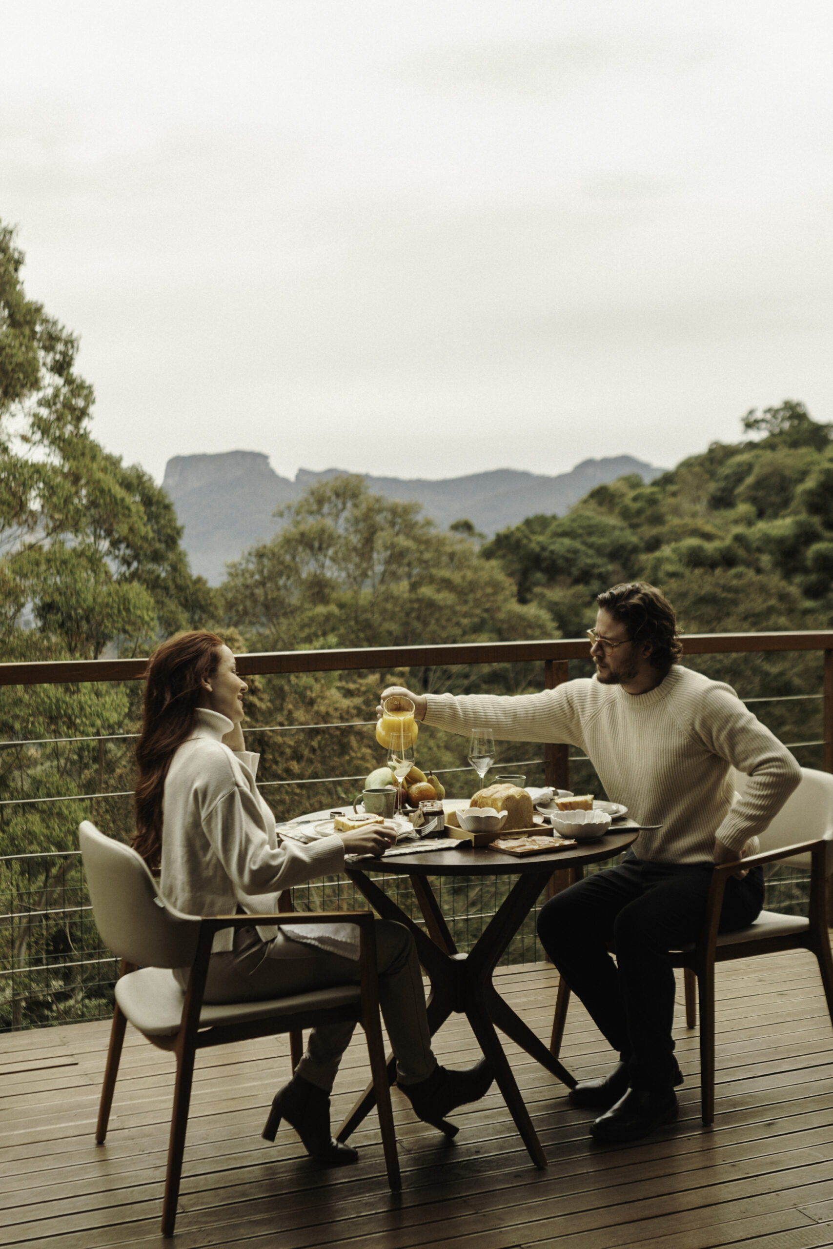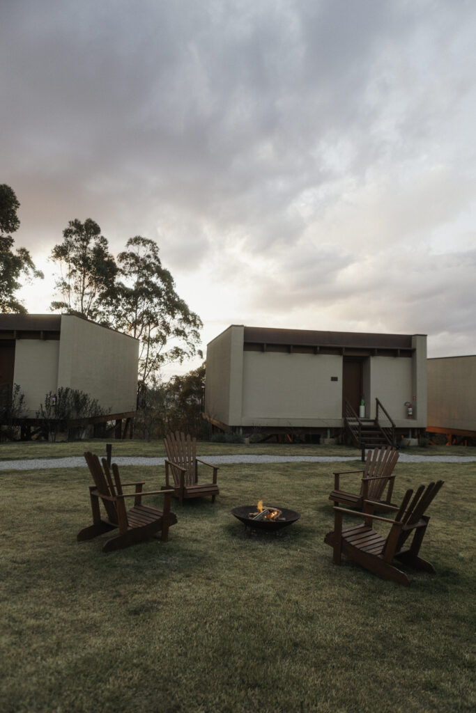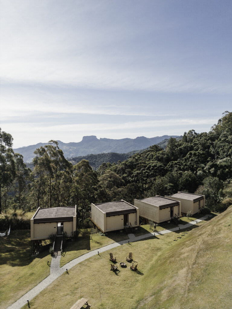 Cada tiny house, com aproximadamente 66 m 2, foi construída em sistema wood frame e oferece cozinha completa, quarto com colchão premium Zissou, sala de estar, banheiro bem equipado e varanda com vista única. A experiência se complementa com Wi-Fi dedicado, sistema de check-in por códigos individuais e infraestrutura compartilhada que inclui sauna seca, redário, lareira externa, churrasqueira portátil, mesa coletiva e um “Mercadinho da Confiança” com produtos regionais no sistema self-service.