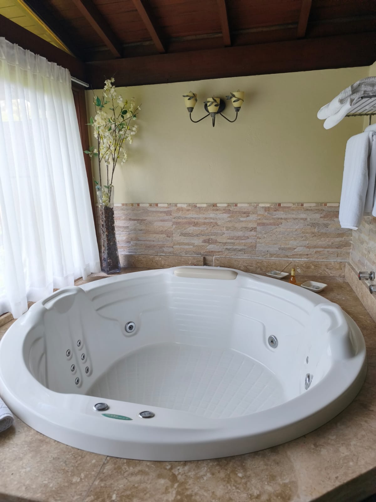 Vídeo 1: Noeli Noel, a funcionária mais antiga do Hotel Campo Verde, apresentando o elogiado café da manhã do hotel; Foto 1: Nathalia e Noeli: de geração em geração os colaboradores do hotel se especializam na arte de receber bem; Vídeo 2: Chale do Vale, com vista para o vale é o único que possui hidromassagem, lareira, mini cozinha e vista para o jardim!; Foto 2: Banheira de hidro do Chalé do Vale; Foto 3: Mimo de boas-vindas oferecido pelo Hotel Canto Verde; Vídeo 3: Suíte onde a jornalista Márcia Santos se hospedou (Imagens e Vídeos: Acervo Pessoal)