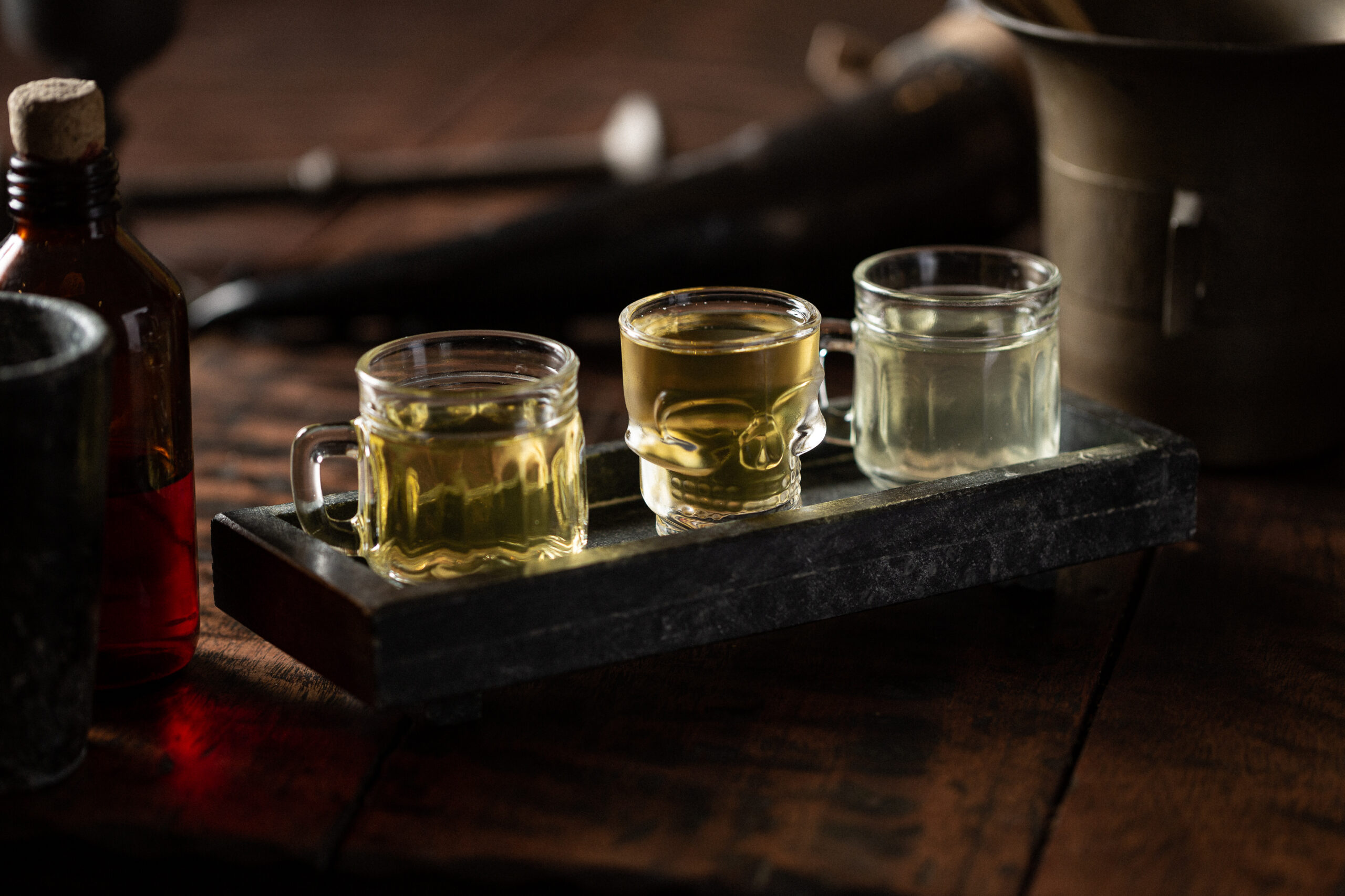 O tradicional Hidromel e as Poções Mágicas são servidos em versões alcoólicas e não alcoólicas para completar a experiência sensorial | Foto 1: Drink Limoncello Druídico; Foto 2: Tábua de Hidromel; Foto 3: Chá de Hibisco (Fotos: Divulgação)