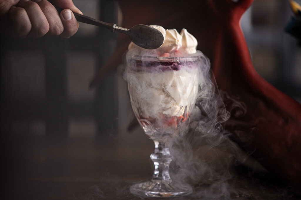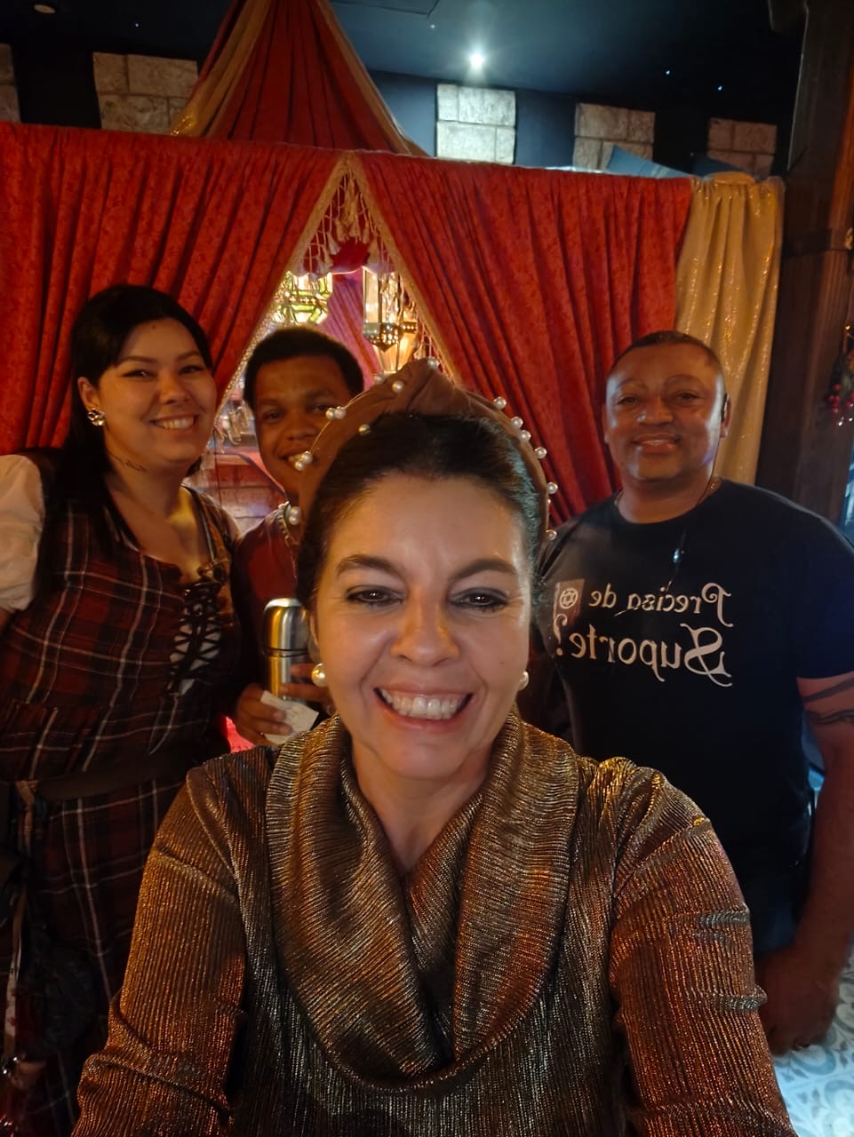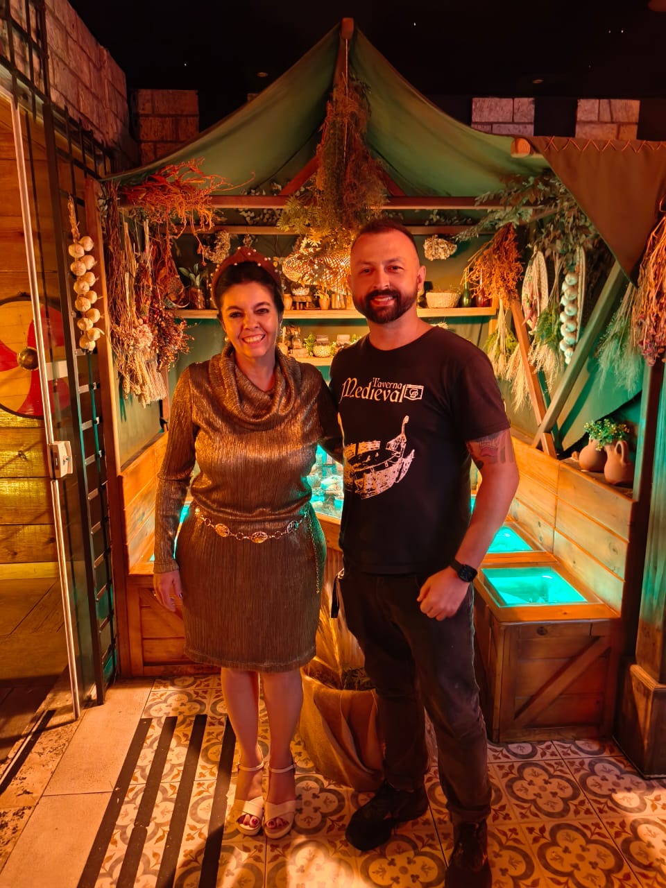 Estive na Taverna Medieval na última quinta-feira e optei por vivenciar a experiência respeitando a dinâmica da casa, que trabalha com reservas por horário. Escolhi o período das 21h às 23h20, o que tornou a noite mais organizada e confortável. Além do staff super atenciosa, foi a proprietária Hellen Lepiani que nos recebeu e contou a história do restaurante. Ela explicou que a ideia nasceu durante o mochilão que ela e o marido (Nelson Ferreira) fizeram pela Europa e ressaltou que, após nove anos de operação no Brasil, é uma honra perceber o quanto as pessoas se identificam e apreciam a proposta do local. Durante a noite, também arrisquei algumas flechas na atividade de Arco e Flecha (o gerente Marco Massarico me acompanhou nessa aventura) _ uma das atrações extras, e foi uma experiência surpreendentemente divertida. No item cardápio (que delícia, gente!), comecei com a famosa Cebola Recheada com Queijo, acompanhada de Suco de Frutas Vermelhas; segui com o Hambúrguer Vegetariano de Falafel (Elfo Noturno Vegano) servido com Chá de Hibisco; e finalizei com o Sopro de Dragão, sobremesa preparada com suspiros feitos com Nitrogênio Líquido, acompanhados de Iogurte com Frutas Vermelhas. Ao morder, a fumaça gelada sai pela boca — resultado da vaporização do nitrogênio em contato com o ar — criando um efeito visual divertido e memorável. Toda a experiência contou com o cuidado e a atenção do staff da casa, com destaque para Bruna Melo e Erick (Especialistas); e Geovane Siqueira e Marco Massarico (Gerentes). Aliás, a sobremesa Sopro de Dragão, responsável por transformar o encerramento da refeição em um verdadeiro espetáculo, foi de autoria do Erick. Veja nossos vídeos e fotos em nossos stories e galeria de imagens. Outro ponto alto da casa é o ritual que acompanha o pedido do vinho canônico: a bebida é servida por um “monge”, em meio a cânticos e música religiosa, criando uma encenação envolvente e coerente com a proposta medieval do espaço.