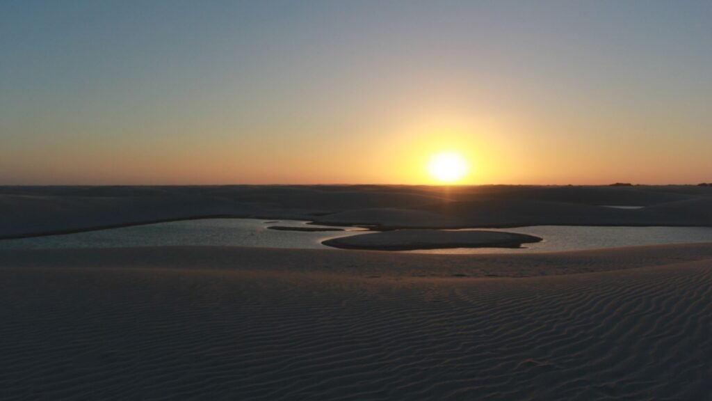 Os Lençóis Maranhenses também são conhecidos como o “Deserto Brasileiro” não pela aridez, mas pelo contraste raro que os torna únicos no mundo. À primeira vista, o mar de dunas brancas remete aos grandes desertos do planeta; no entanto, durante o período de chuvas, essas mesmas dunas se transformam em um mosaico de lagoas de água doce e azuis, alimentadas por aquíferos subterrâneos e pelas chuvas tropicais. Essa dinâmica singular cria um cenário em constante mutação, onde areia e água surgem em equilíbrio, desafiando a própria definição de deserto e projetando os Lençóis Maranhenses como um fenômeno natural de relevância mundial.
