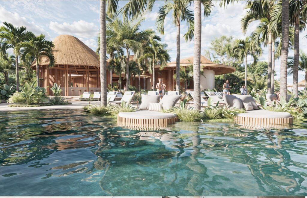 O projeto arquitetônico inclui elementos naturais como cenotes e cachoeiras integrados ao cenário caribenho. É uma proposta de design que une a beleza natural ao luxo contemporâneo (Foto: Divulgação)