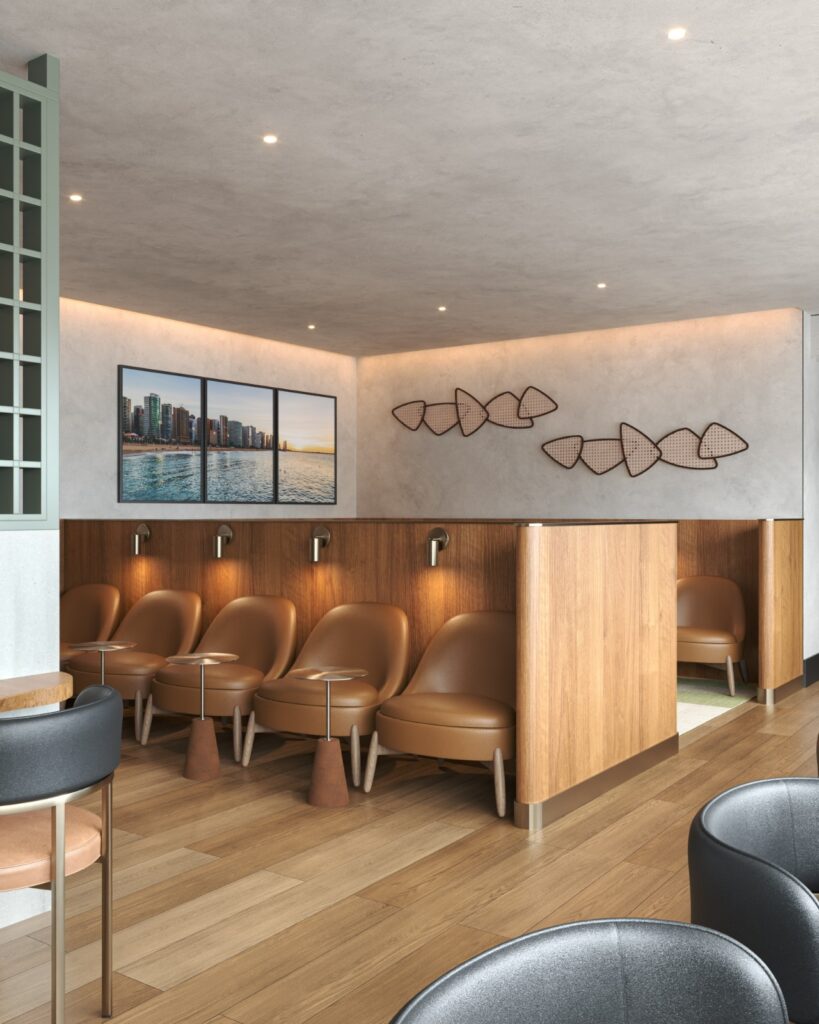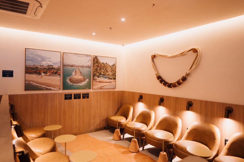 Localizada após a área do Duty Free, a nova sala internacional conta com mais de 150 m² e foi pensada para elevar sua experiência antes do voo. O espaço reúne bar completo com seleção de bebidas, buffet variado, duchas para um banho revigorante e um ambiente sofisticado com 38 assentos.